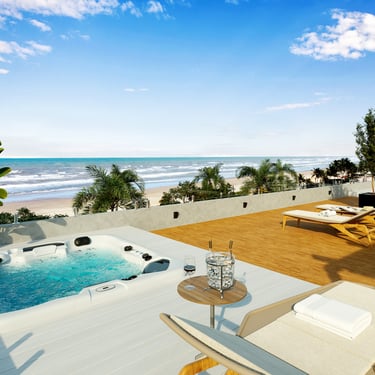 Vista para o mar e hidromassagem para relaxar com estilo.Wellness Center